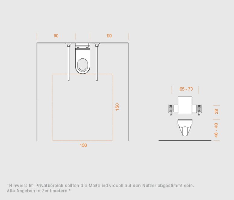 - Sanitärinstallationen müssen so vorbereitet werden, dass Haltegriffe, höhenverstellbare WCs oder Duschsitze sicher montiert werden können (Tragfähigkeit der Wände, Vorwandinstallation).