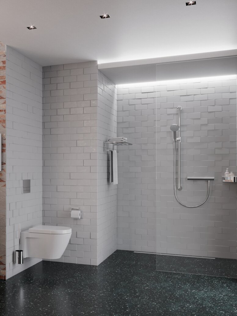 Ist allerdings nur ein Duschvorhang möglich, dann ist es vorteilhaft, einen hellen Vorhang zu wählen. Dieser schluckt das Licht nicht. Wird die Dusche nicht genutzt, kann der Duschvorhang aufgeschoben werden. So fällt Licht ein und der Raum wirkt größer. HEWI bietet maßangefertigte Deckenabhängungen sowie Duschvorhänge nach Maß an. Somit lässt sich der Vorhang mitsamt Befestigung an jede bauliche Begebenheit anpassen.
