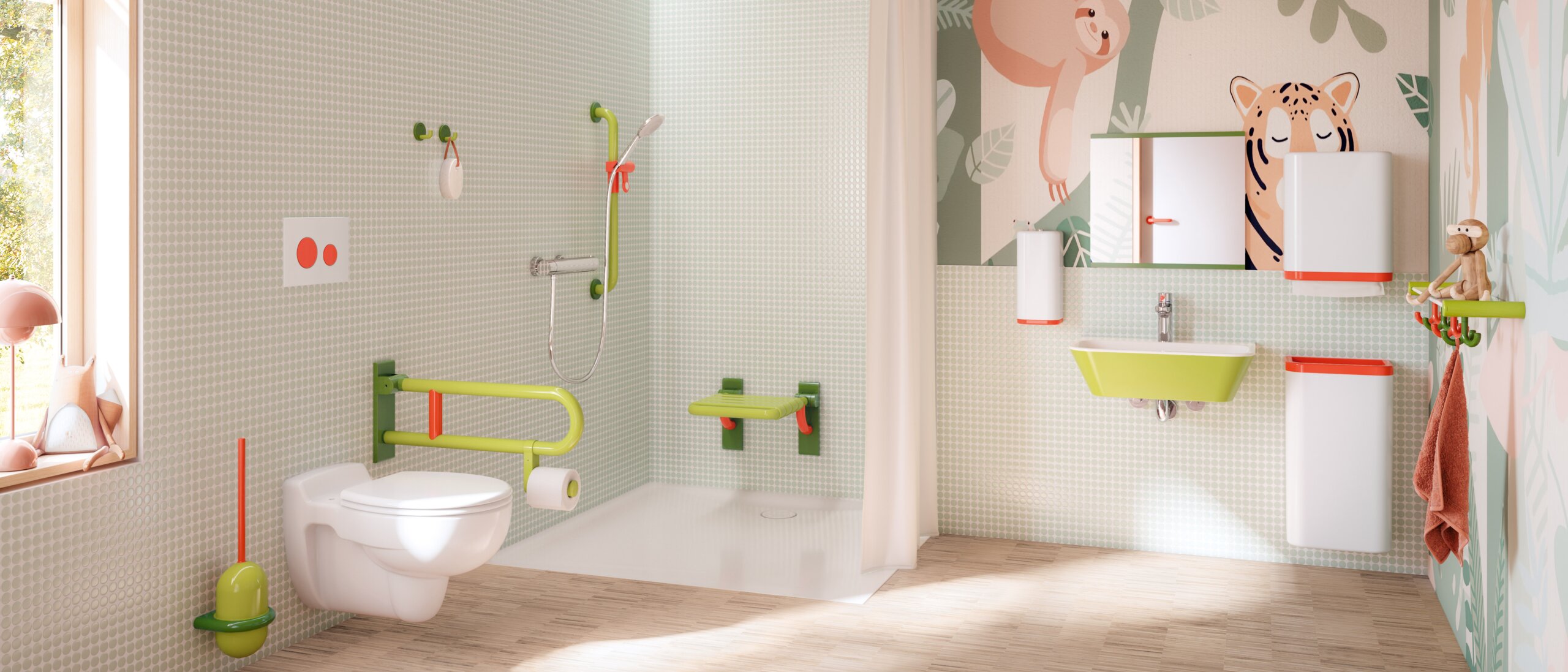 Farbige Waschtische und kindgerechte Motive regen zum Mitmachen an und machen Hygiene zum positiven Ritual.