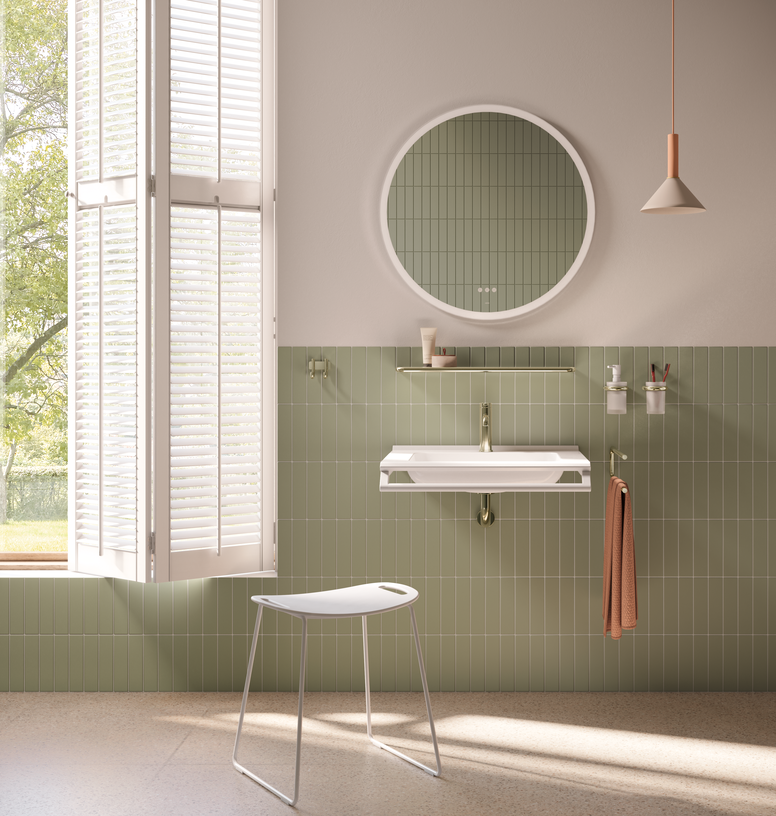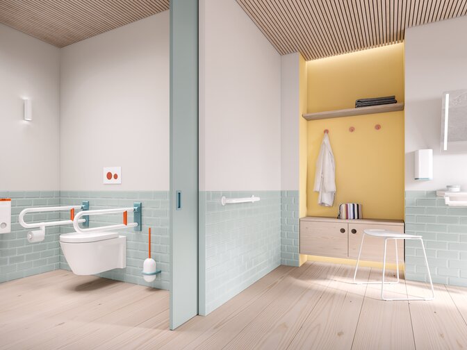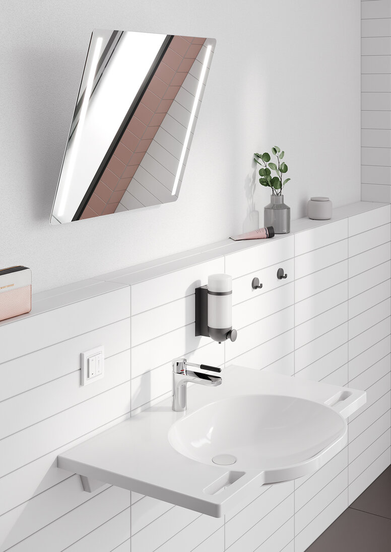 It is available in stainless steel, chrome or powder-coated in white, black or grey as well as with PVC surfaces in various shades and belongs to the System 900 range of accessible solutions.