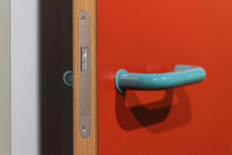 Mini enables elegant contrasts between lever handle and door leaf through color combinations. But the reduced design can also be integrated inconspicuously on a colored door, as the exhibition in the Alte Fügerei F10 shows.