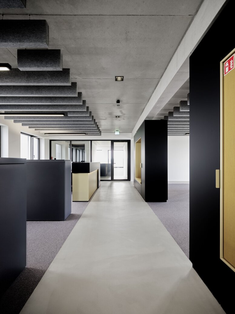 The employees at Firner Trautwein appreciate the high design quality of their working environment with plenty of natural light, black, wood and textile elements in grey.