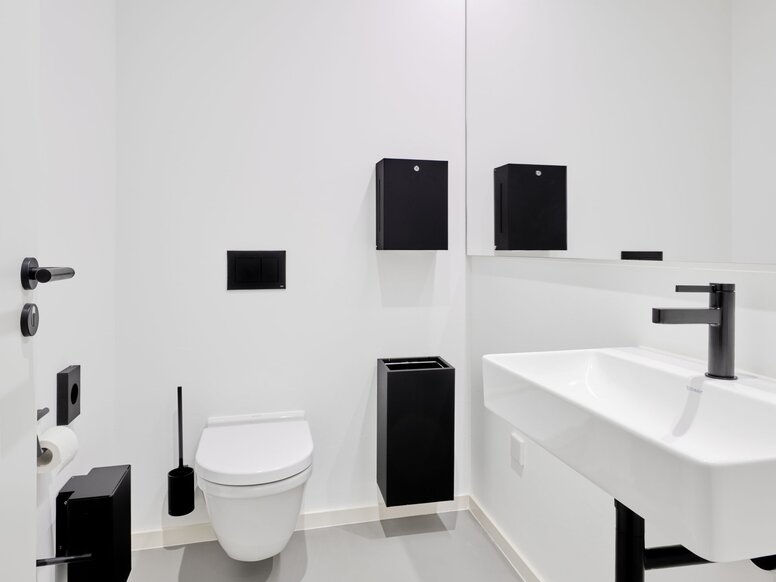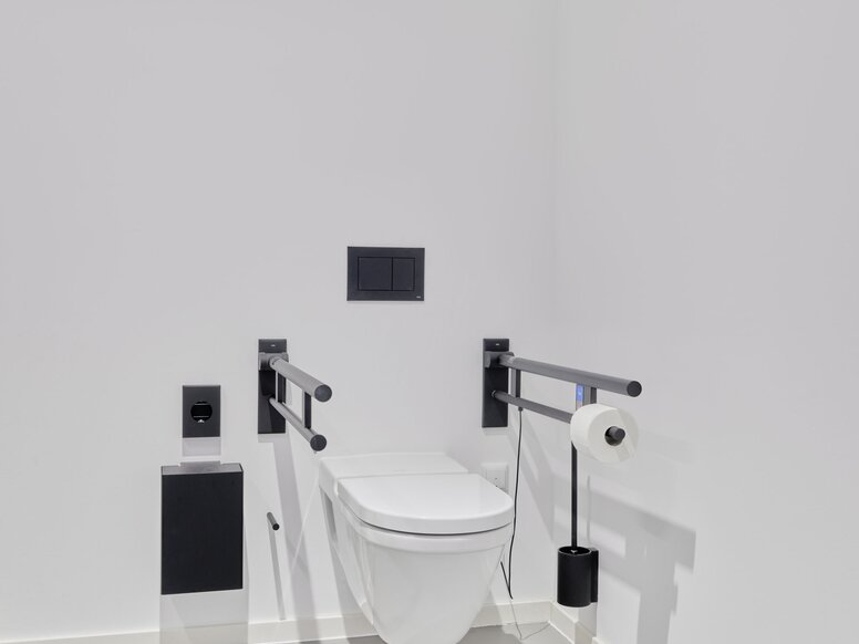 The HEWI System 900 offers a wide range of seamlessly combinable products for sanitary rooms, including the accessibility WCs at Firner Trautwein. The dark colour scheme of the bathroom accessories is just as consistent here as in the other areas.