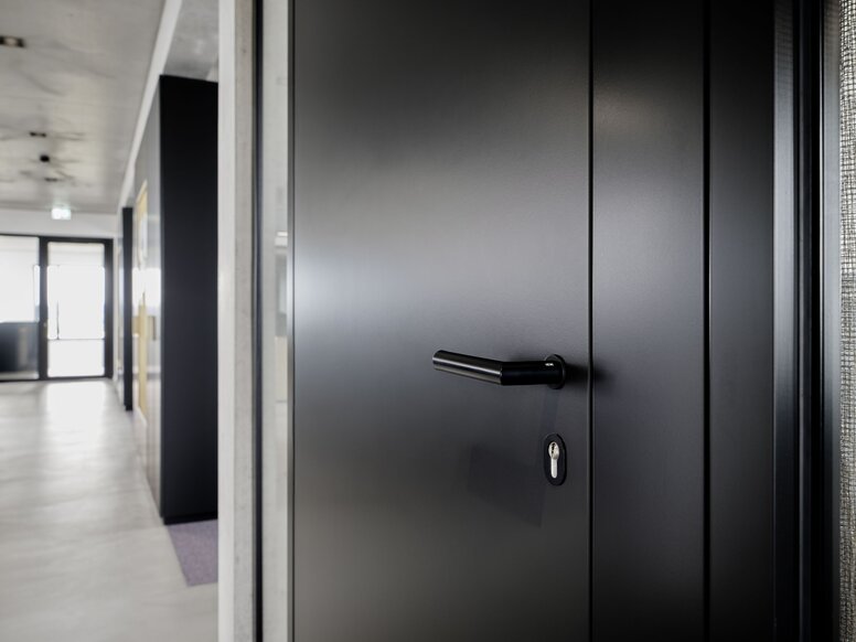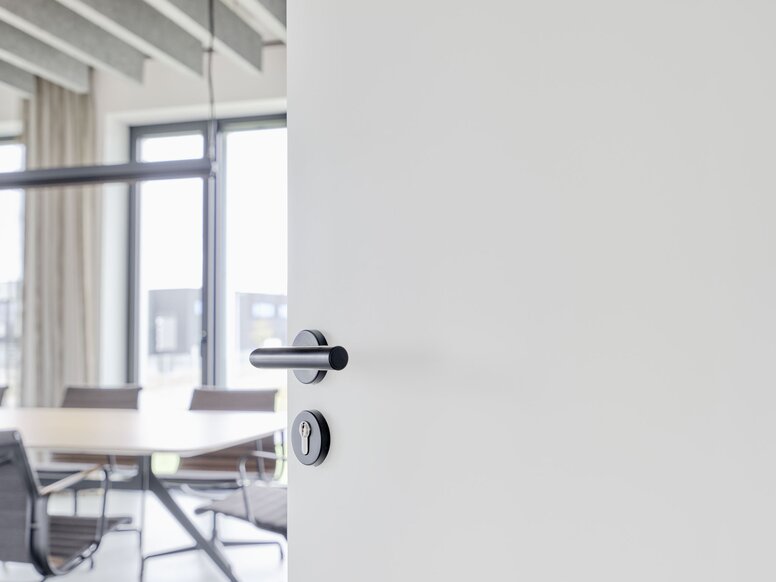 Deep black on white: Only the darkest version of lever handles from HEWI's System 162 can be found in administration buildings.