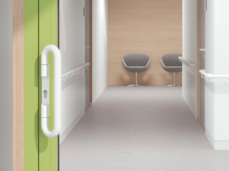 Especially for hospitals and nursing wards, lever handles with extended lever are a practical solution. Due to the longer lever, less force is required to open the door, which accommodates physically impaired persons. Even the staff profits from this type of lever handles, since they can easily be operated with the elbow. Similar benefits are offered by lever handles in U-shape. The touch-free operation also ensures an increased level of hygiene. U-shaped lever handles prevent unintentional catching of clothes and reduces the risk of injuries. Moreover, the rounded, ergonomic shape permits easy operation.