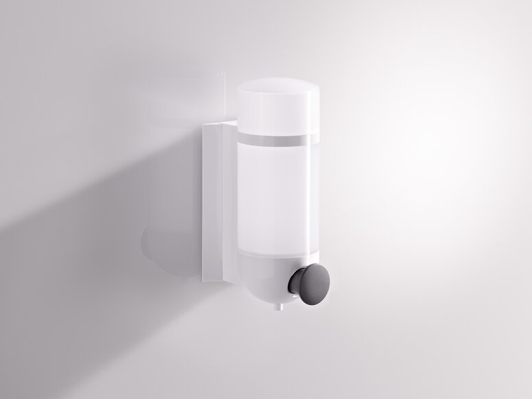 On the soap dispenser, only the push button for dosing the soap is clearly highlighted by the colour contrast. The slightly roughened surface of the push button also makes the functional element palpable.