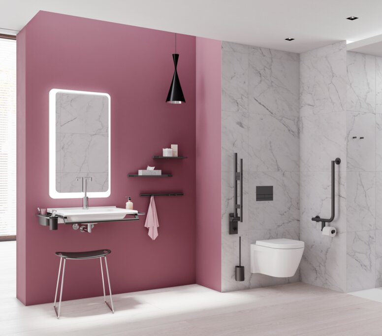 En tant que planificateur·rice, vous offrez un confort maximal grâce aux produits d'assistance de la gamme WARM TOUCH. WARM TOUCH associe les propriétés visuelles des surfaces chromées brillantes aux propriétés tactiles du polyamide, offrant ainsi une alternative aux produits traditionnels en chrome froid. Les alternatives chaudes sont plus agréables à prendre en main, en particulier pour les patient·es sensibles au froid ou les personnes âgées, et constituent une solution idéale selon les critères de la Healing Architecture.