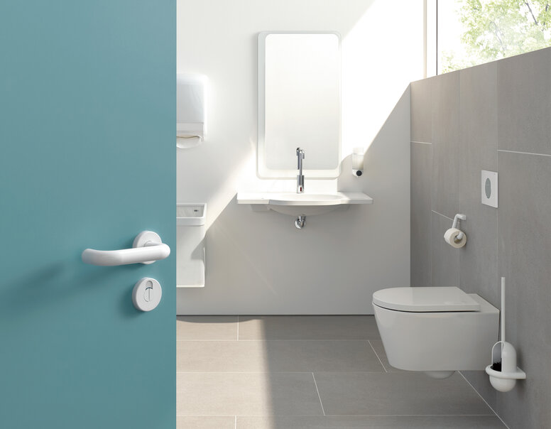 Les produits accessibles à tous du système 900 HEWI se distinguent par un nettoyage particulièrement facile ainsi que par une surface robuste et hygiénique. Grâce aux différentes surfaces et couleurs, cette gamme de produits offre de nombreuses options de conception aux architectes et vous permet également de satisfaire toutes les demandes des patient·es.