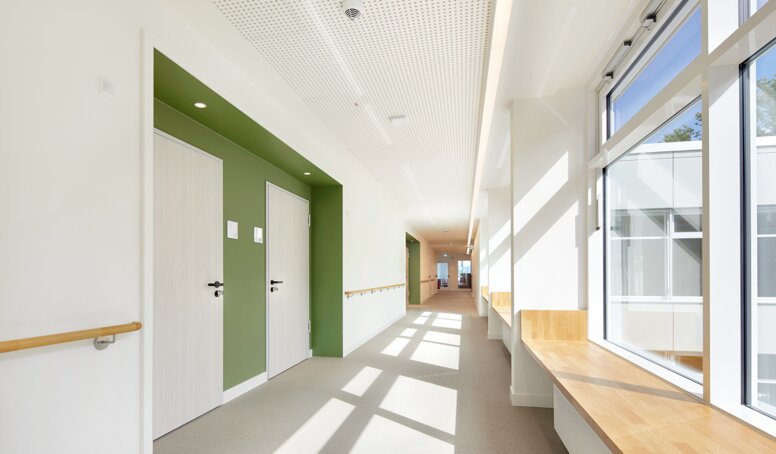 L’acoustique est également un facteur important de la Healing Architecture pour le confort à l’hôpital. Les matériaux qui absorbent le son et les plafonds insonorisants spéciaux contribuent à réduire le niveau de bruit et à créer un environnement plus calme. Cela améliore non seulement le confort et le processus de guérison des patient·es, mais aussi les conditions de travail du personnel.